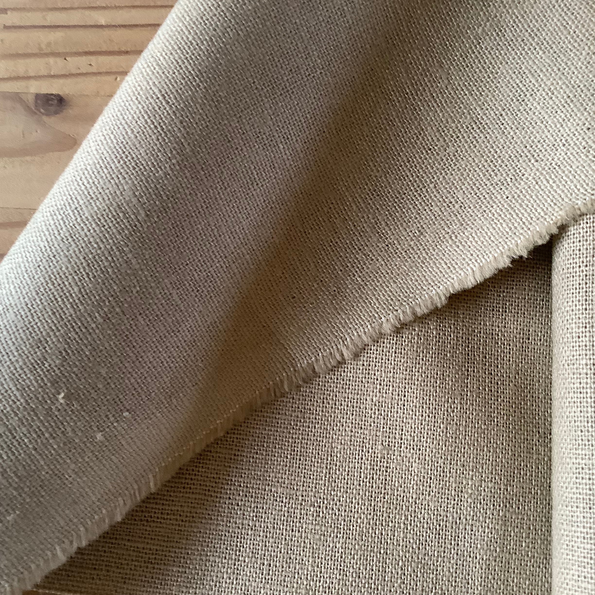 画像では非常に薄く明る目のお色に写っておりますが、現物はかなり暗めのダークマスタードベージュ色です。生地目、お色ともに、好みの分かれる生地かと思いますが、リネン専門店などでは同等の番手の生地が高価な上質ラインとして出ており、ご用途に見合う方にはお勧めです。